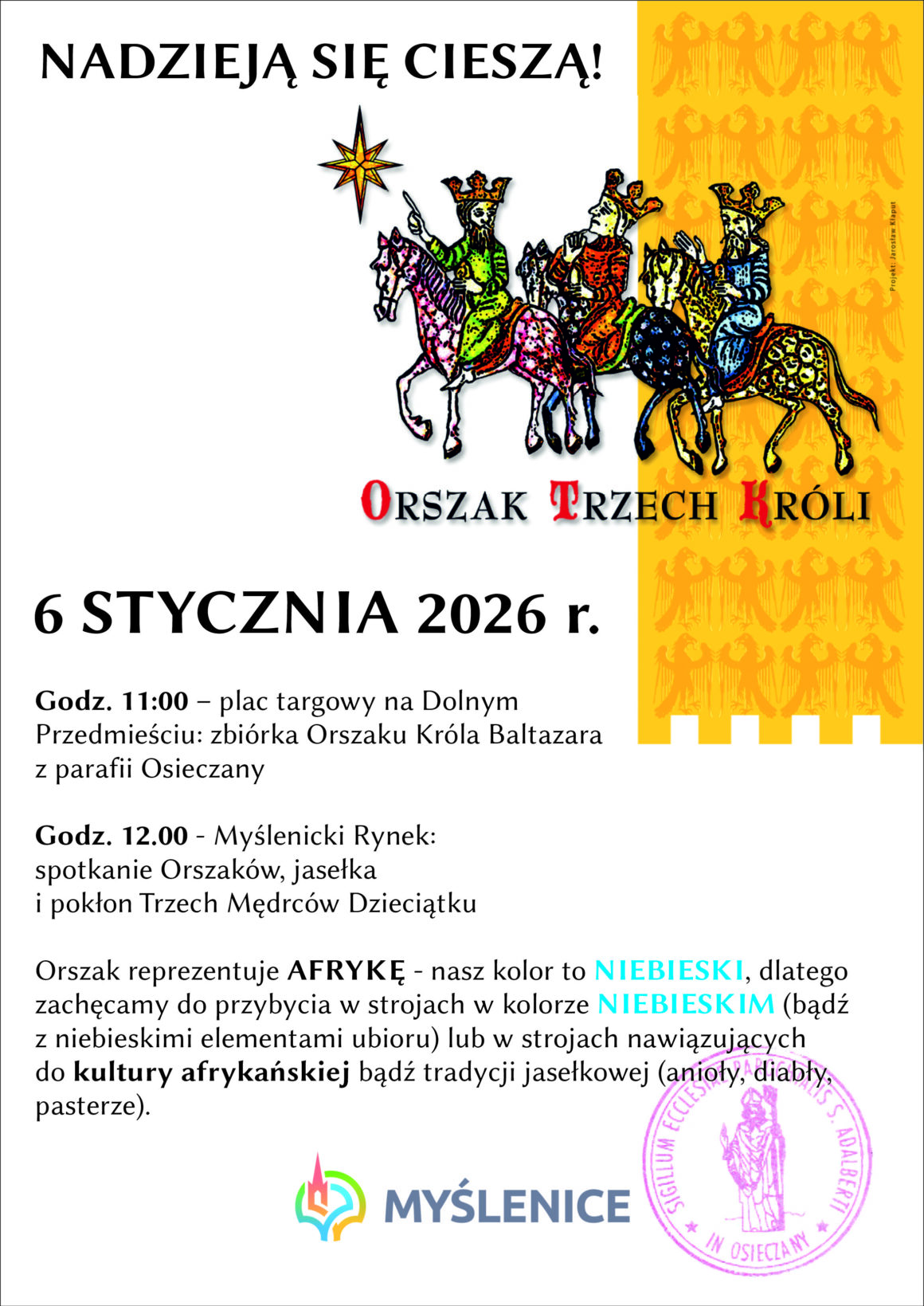 Gmina Myślenice wraz z parafią św. Wojciecha w Osieczanach zapraszają w dniu 6 stycznia (wtorek) na Orszak Trzech Króli. Spotykamy się na Placu Targowym na Dolnym Przedmieściu o godz. 11.00, gdzie zostaną rozdane korony, naklejki i śpiewniki oraz będzie można nabyć rekwizyty orszakowe (balony z helem, chorągiewki, podkoszulki, turbany). Z tego miejsca o godz. 11.15 wyruszymy wraz z królem afrykańskim Baltazarem i jego świtą w kierunku myślenickiego Rynku, gdzie będziemy uczestniczyć w jasełkach i pokłonie Trzech Króli. Zachęcamy do przybycia w strojach w kolorze niebieskim lub nawiązujących do kultury afrykańskiej. Na myślenickim Rynku będzie można złożyć dary w namiocie Caritas na rzecz ubogich, napić się ciepłej herbaty i zjeść żurek.